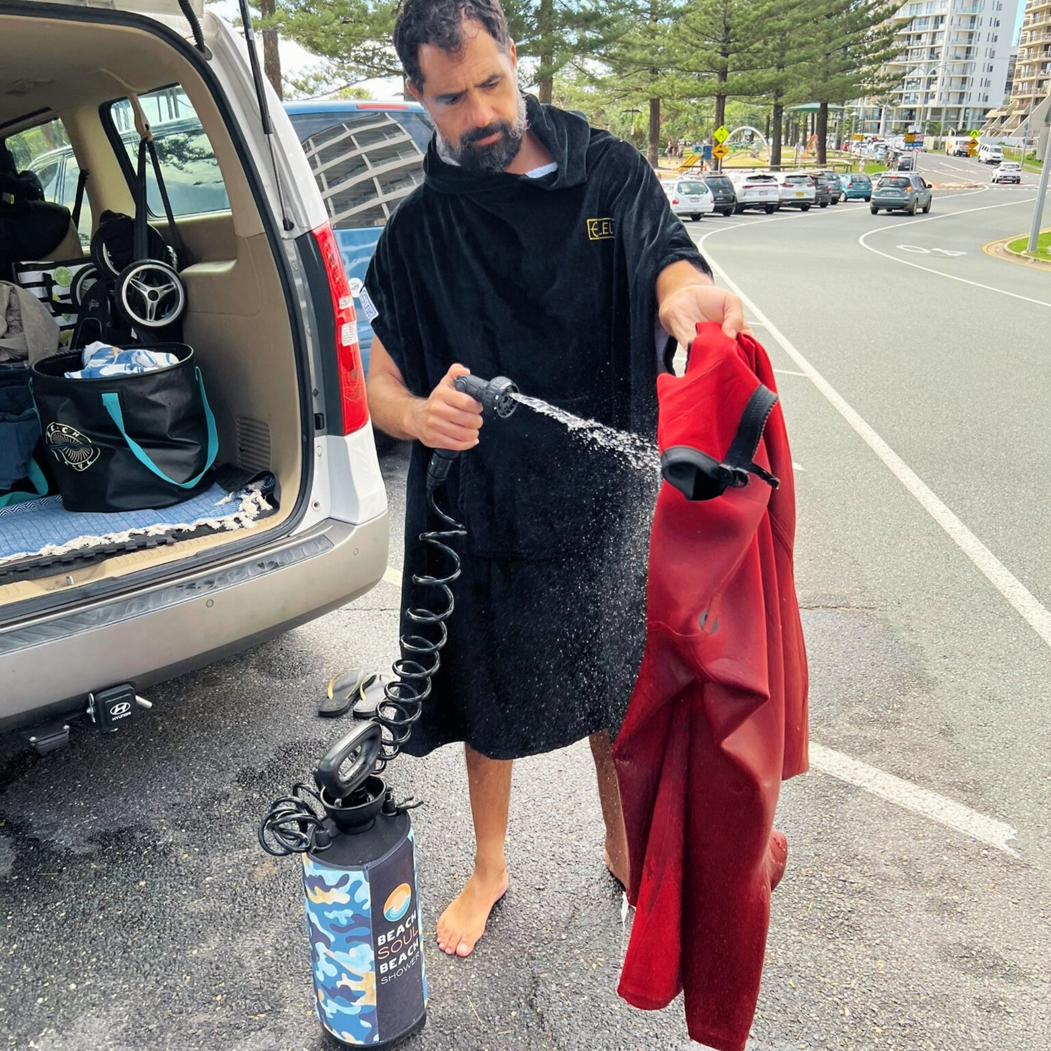 With 8L of pressurised flow, it’s built for trail walkers, wave chasers, and anyone who likes to rinse off without the fuss.