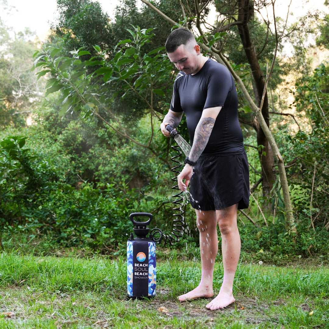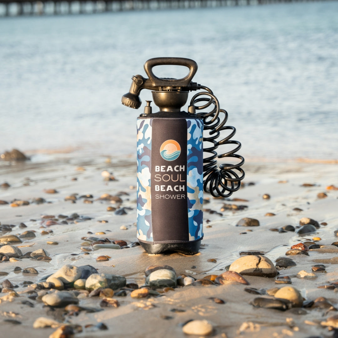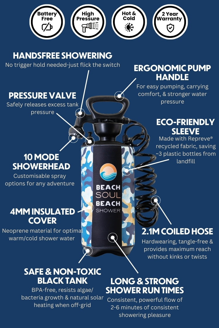With calm green and blue tones, its custom Beach Soul sleeve blends into wild places while standing out where it counts. From weekend hikes to off-grid surf missions, this tough, battery-free shower has your back.
