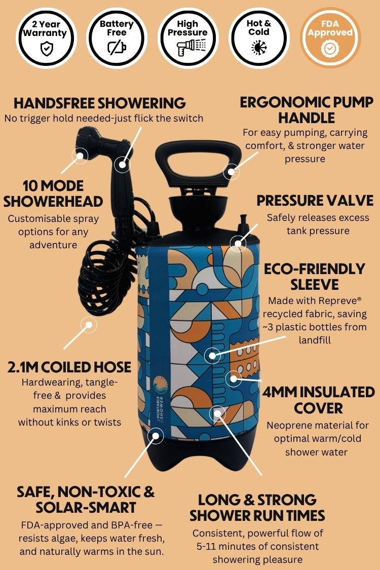 Enjoy the Outdoors with Total Shower Freedom: This water-loving, pattern-popping, hydration-handy portable shower is built for calm rinses, clean adventures, & drink-safe flow wherever nature takes you.